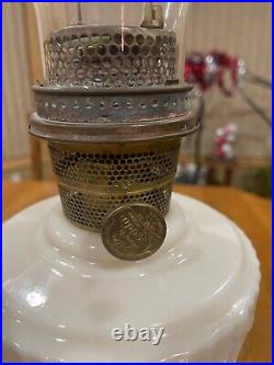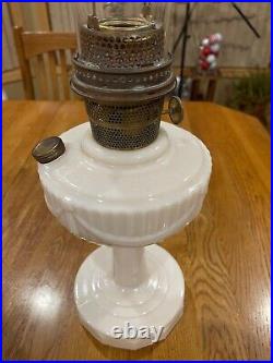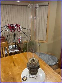 Elevate your home decor with the timeless elegance of the Aladdin Tall Lincoln Drape Alactite Oil Lamp, Model B-75. A piece steeped in history, this lamp hails from the 1940s, offering a touch of American vintage charm. Its pristine white glass exudes a classic beauty that complements any room's ambiance. The lamp features a functional knob control, allowing for easy adjustment of the oil level and flame brightness.