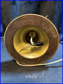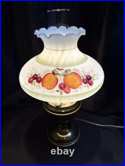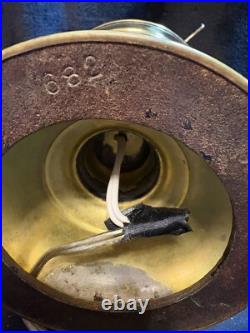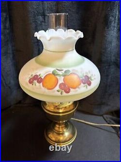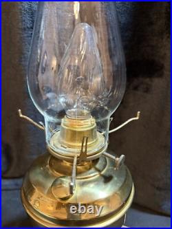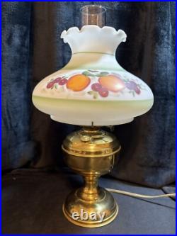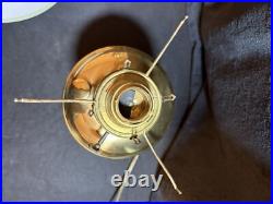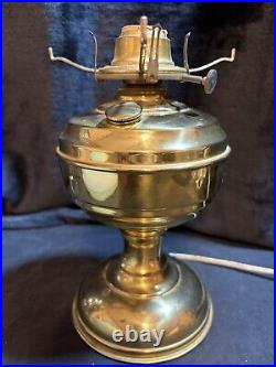 Oil Lamp Electrified Aladdin Model Brass No 11 Hurricane Floral Bisque Shade. The top globe is 9" in diameter x 6 1/2" tall and goes into a 7 fitter. The partially clear chimney is 9" tall and goes into a 2 5/8" fitter. The solid brass base is 5 1/8" in diameter and 8" tall. Excellent used condition, no dents, cracks or chips.